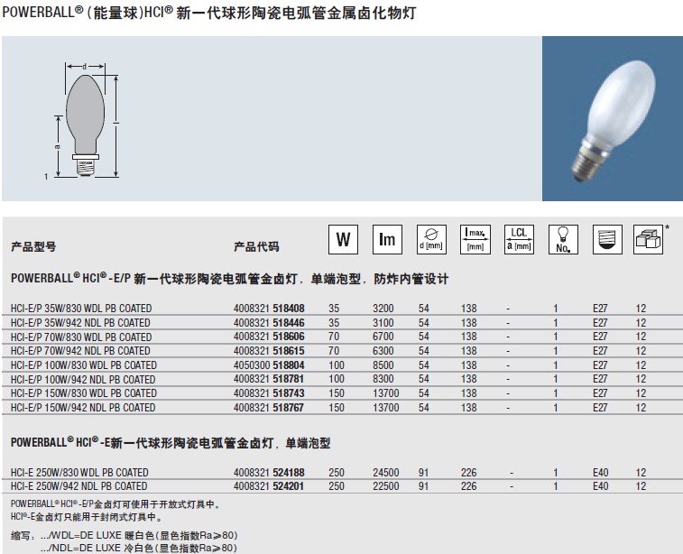 - 產品型號 OSRAM HCI--E/P 35W, 70W, 100W/830 coated