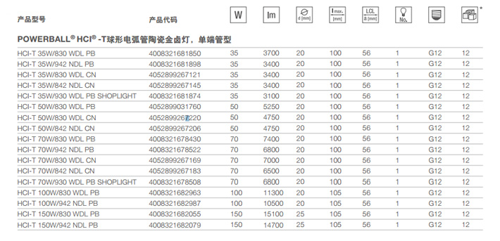 POWERBALL陶瓷技術,光色:暖白(830 WDL)、中性白(942 WDL),平均使用壽命: 15000 小時(配用 ECG,70…400 Hz 方波電流),平均壽命:12,000 h(工作于電感鎮(zhèn)流器),HCI-T 50 W 只能和 ECG 一起使用,且必須為其提供 70…400 Hz 方波電流