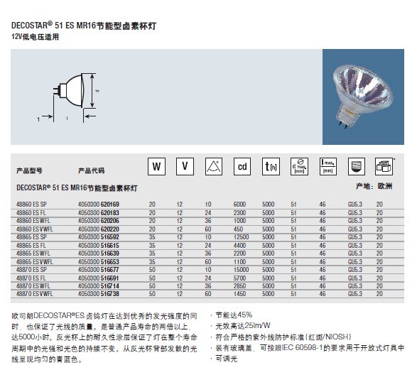 歐司朗48855 ECO SP 12V 14W MR16節(jié)能型鹵鎢杯燈 6度