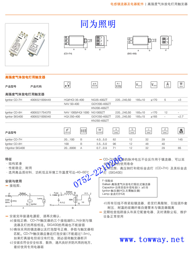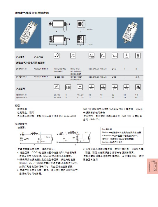 產品介紹:配合osram 鎮流器 電容 使用CD-8H觸發器的脈沖電壓不會反作用于鎮流器,可以延長鎮流器的儾用壽命應用范圍:高壓鈉燈和歐標金鹵燈(CD-8H)及美標金鹵燈(SIG 400)
